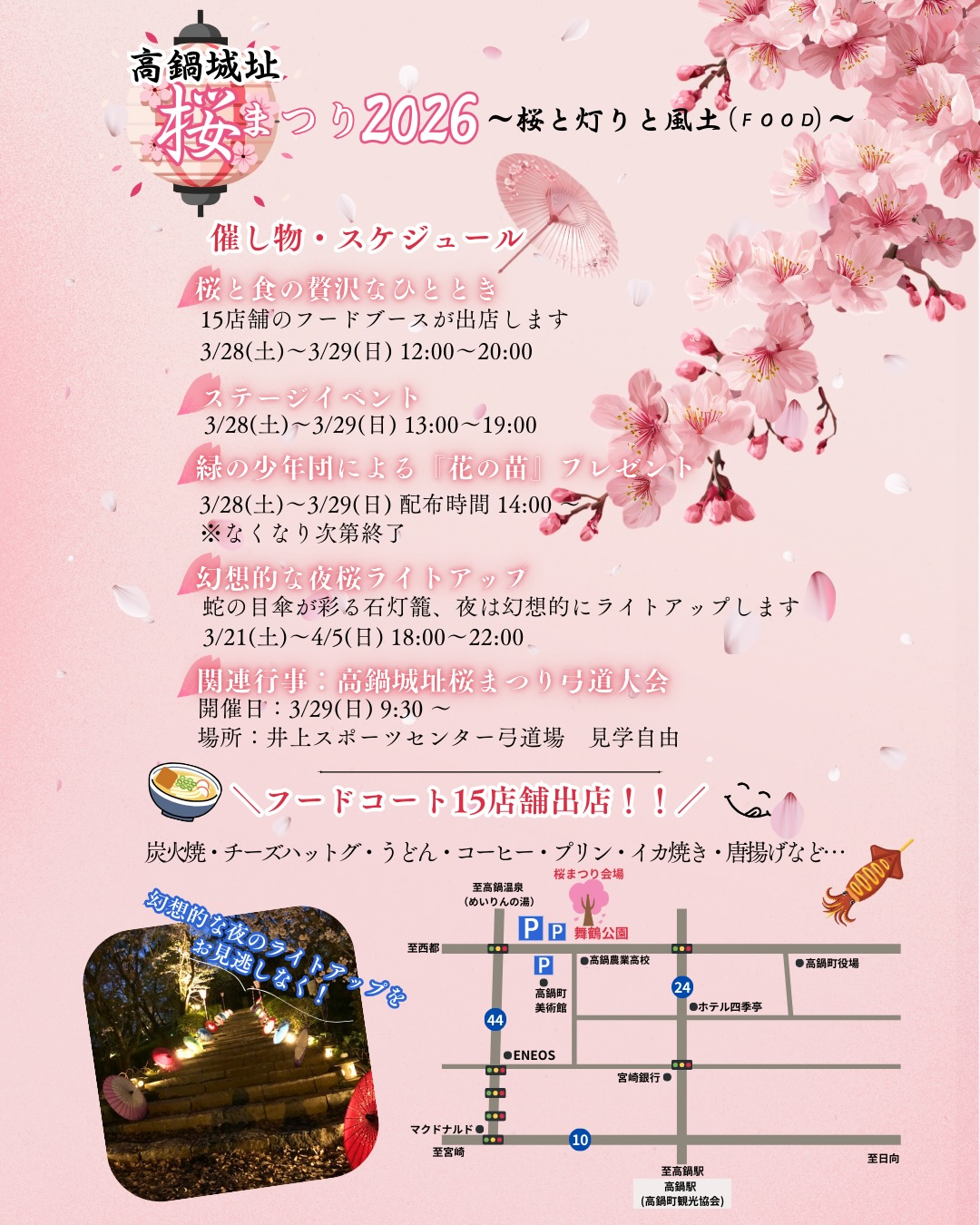 また、緑の少年団からの花の苗プレゼントや夜桜ライトアップなど、食もステージも夜も楽しめる2日間です。