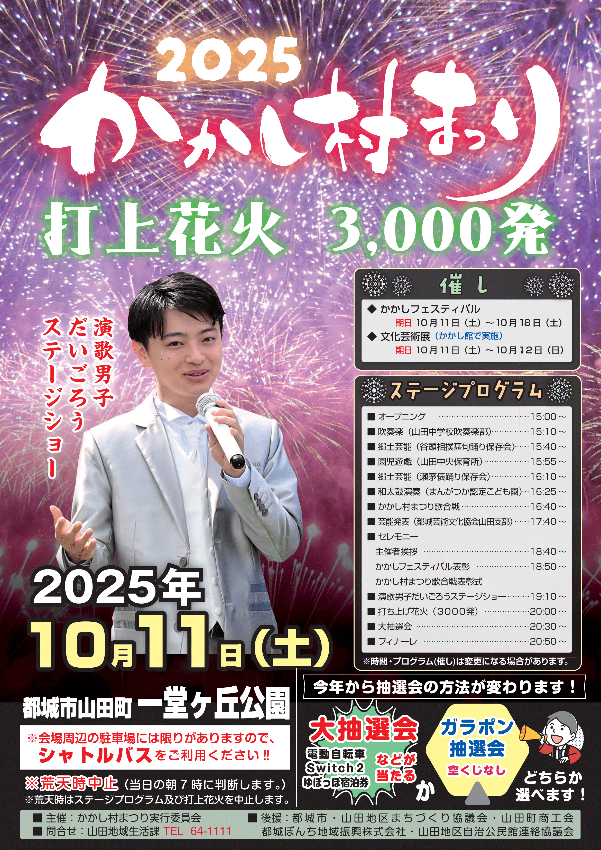 | 開催時間 | 15:00~ オープニング 15:10~ 文化活動発表(吹奏楽、郷土芸能、園児遊戯等) 16:40~ かかし村まつり歌合戦 17:40~ 芸能発表(都城芸術文化協会山田支部) 18:40~ セレモニー・表彰 19:10~ ステージショー※出演予定(演歌男子だいごろう) 20:00~ 花火打上(3,000発) 20:30~ 抽選会 20:50~ フィナーレ |