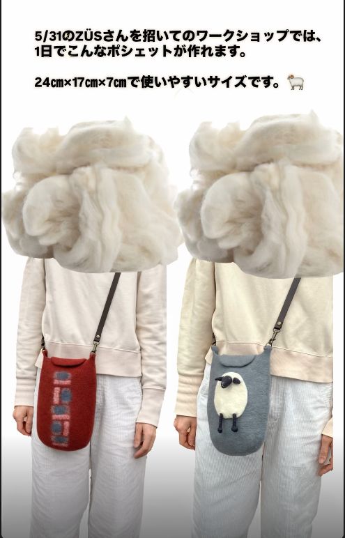 フェルトバッグを1日で完成させるワークショップを開催します。人気フェルト作家 ZÜSさんをお迎えし、オリジナルのフェルトバッグを制作します。材料や道具はすべてご用意していますので、初めての方でも安心してご参加いただけます。手仕事が好きな方、ものづくりに興味のある方、ぜひこの機会にご参加ください。羊モチーフまたはモザイクモチーフからお選びいただき、お好きな地色(黒・グレー・茶・青・赤・緑)で 自分だけのバッグを制作していただけます。