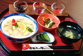 都農町の名産・金色の「シロサバフグ」を使用したふぐ丼は、地元で受け継がれる調理法「やっきり」をアレンジして作られたご当地グルメ。ふぐの皮が入ったふぐ汁、季節の副菜などがセットになっていて、手頃な値段で食べられるのも魅力です。